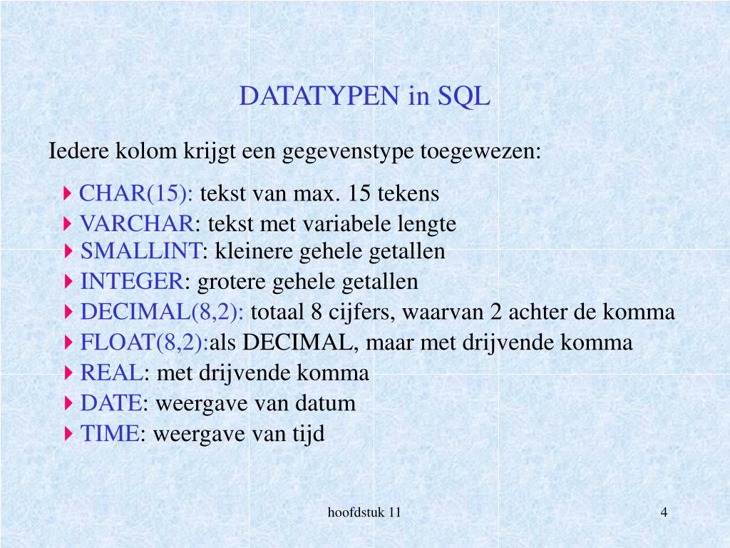 DATATYPEN in SQL Iedere kolom krijgt een gegevenstype toegewezen: CHAR(15): tekst van max. 15 tekens VARCHAR: tekst met variabele lengte SMALLINT: kleinere gehele getallen INTEGER: grotere gehele getallen DECIMAL(8,2): totaal 8 cijfers, waarvan 2 achter de komma FLOAT(8,2):als DECIMAL, maar met drijvende komma REAL: met drijvende komma DATE: weergave van datum TIME: weergave van tijd hoofdstuk 11