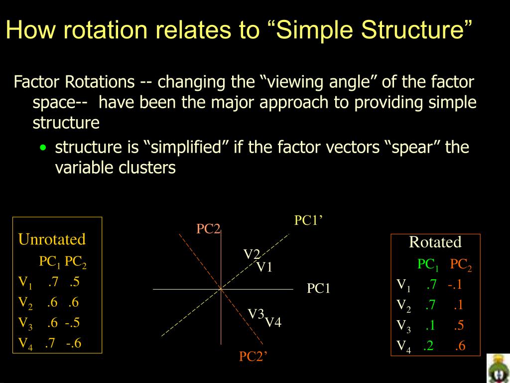 How rotation relates to “Simple Structure” Factor Rotations -- changing the “viewing angle” of the factor space-- have been the major approach to providing simple structure • structure is “simplified” if the factor vectors “spear” the variable clusters PC1’ Unrotated PC1 PC2 V1 .7 .5 V2 .6 .6 V3 .6 -.5 V4 .7 -.6 PC2 Rotated PC1 PC2 V1.7 -.1 V2.7 .1 V3 .1 .5 V4.2 .6 V2 V1 PC1 V3 V4 PC2’