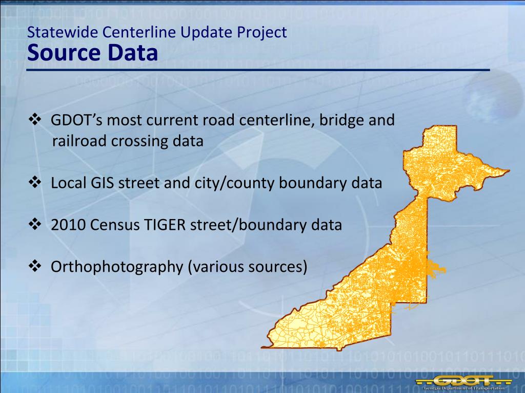 Statewide Centerline Update Project Source Data • GDOT’s most current road centerline, bridge and railroad crossing data • Local GIS street and city/county boundary data • 2010 Census TIGER street/boundary data • Orthophotography (various sources)