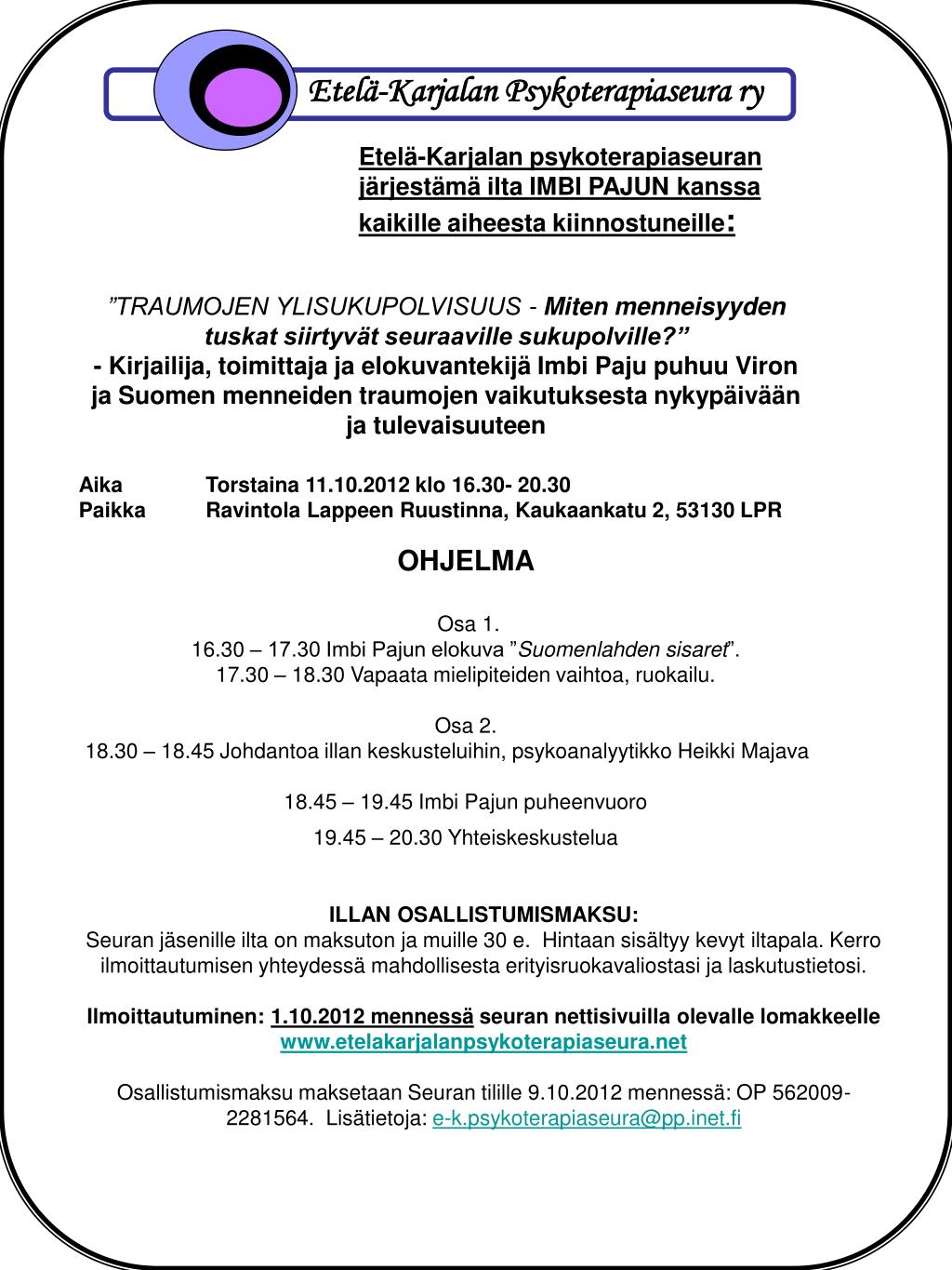 Etelä-Karjalan Psykoterapiaseura ry Etelä-Karjalan psykoterapiaseuran järjestämä ilta IMBI PAJUN kanssa kaikille aiheesta kiinnostuneille: ”TRAUMOJEN YLISUKUPOLVISUUS -Miten menneisyyden tuskat siirtyvät seuraaville sukupolville?” - Kirjailija, toimittaja ja elokuvantekijä Imbi Paju puhuu Viron ja Suomen menneiden traumojen vaikutuksesta nykypäivään ja tulevaisuuteen Aika Torstaina 11.10.2012 klo 16.30- 20.30Paikka Ravintola Lappeen Ruustinna, Kaukaankatu 2, 53130 LPR OHJELMA Osa 1. 16.30 – 17.30 Imbi Pajun elokuva ”Suomenlahden sisaret”. 17.30 – 18.30 Vapaata mielipiteiden vaihtoa, ruokailu. Osa 2. 18.30 – 18.45 Johdantoa illan keskusteluihin, psykoanalyytikko Heikki Majava 18.45 – 19.45 Imbi Pajun puheenvuoro 19.45 – 20.30 Yhteiskeskustelua ILLAN OSALLISTUMISMAKSU: Seuran jäsenille ilta on maksuton ja muille 30 e. Hintaan sisältyy kevyt iltapala. Kerro ilmoittautumisen yhteydessä mahdollisesta erityisruokavaliostasi ja laskutustietosi. Ilmoittautuminen: 1.10.2012 mennessä seuran nettisivuilla olevalle lomakkeelle www.etelakarjalanpsykoterapiaseura.net Osallistumismaksu maksetaan Seuran tilille 9.10.2012 mennessä: OP 562009-2281564. Lisätietoja: e-k.psykoterapiaseura@pp.inet.fi