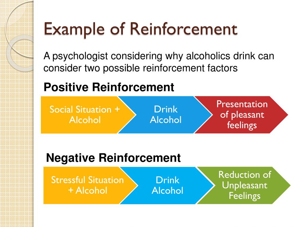Example of Reinforcement A psychologist considering why alcoholics drink can consider two possible reinforcement factors Positive Reinforcement Negative Reinforcement