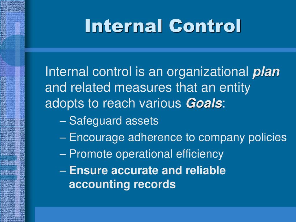 Internal Control Internal control is an organizational plan and related measures that an entity adopts to reach various Goals: • Safeguard assets • Encourage adherence to company policies • Promote operational efficiency • Ensure accurate and reliable accounting records