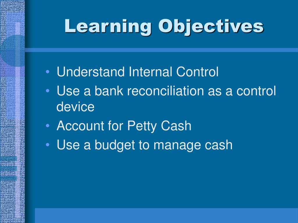 Learning Objectives • Understand Internal Control • Use a bank reconciliation as a control device • Account for Petty Cash • Use a budget to manage cash