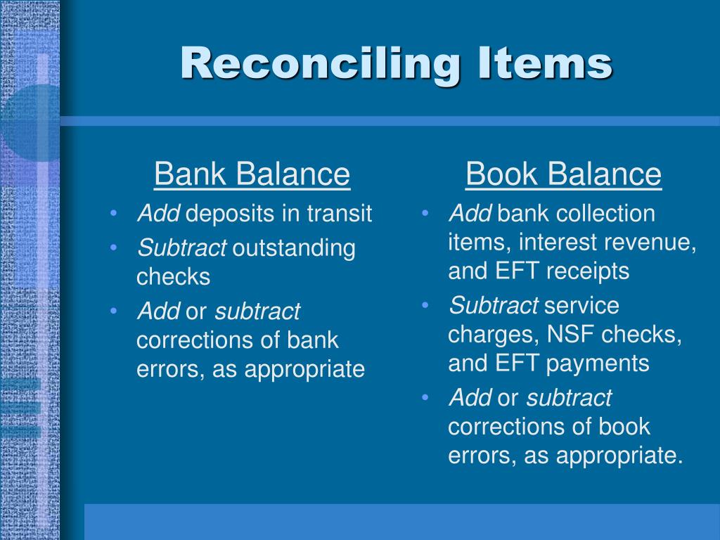 Bank Balance Add deposits in transit Subtract outstanding checks Add or subtract corrections of bank errors, as appropriate Book Balance Add bank collection items, interest revenue, and EFT receipts Subtract service charges, NSF checks, and EFT payments Add or subtract corrections of book errors, as appropriate. Reconciling Items