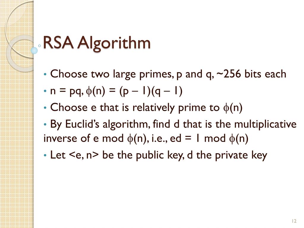 RSA Algorithm Choose two large primes, p and q, ~256 bits each n = pq, (n) = (p – 1)(q – 1) Choose e that is relatively prime to (n) By Euclid’s algorithm, find d that is the multiplicative inverse of e mod (n), i.e., ed = 1 mod (n) Let <e, n> be the public key, d the private key