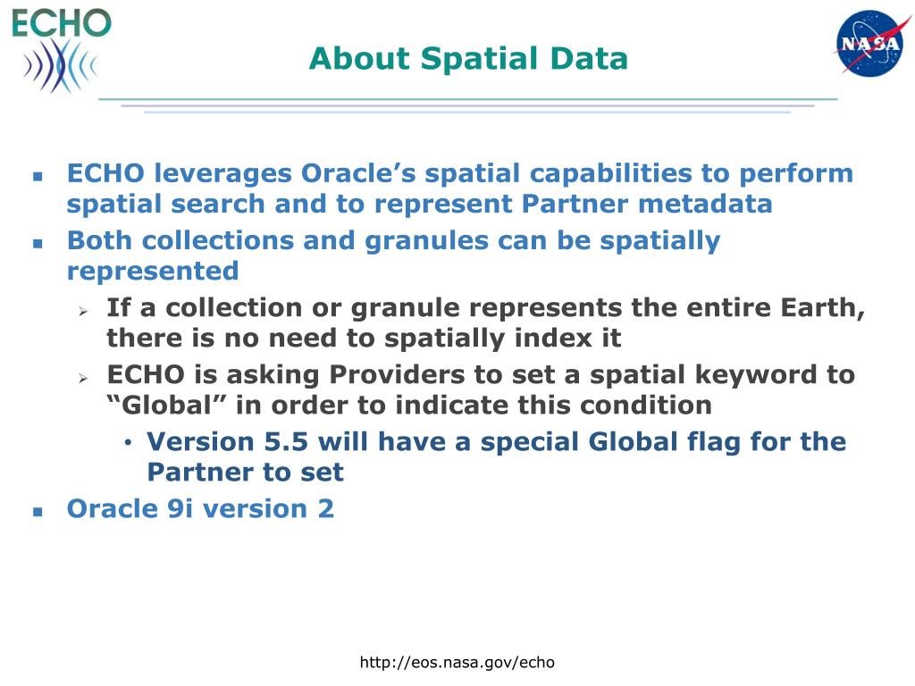 About Spatial Data • ECHO leverages Oracle’s spatial capabilities to perform spatial search and to represent Partner metadata • Both collections and granules can be spatially represented • If a collection or granule represents the entire Earth, there is no need to spatially index it • ECHO is asking Providers to set a spatial keyword to “Global” in order to indicate this condition • Version 5.5 will have a special Global flag for the Partner to set • Oracle 9i version 2 http://eos.nasa.gov/echo