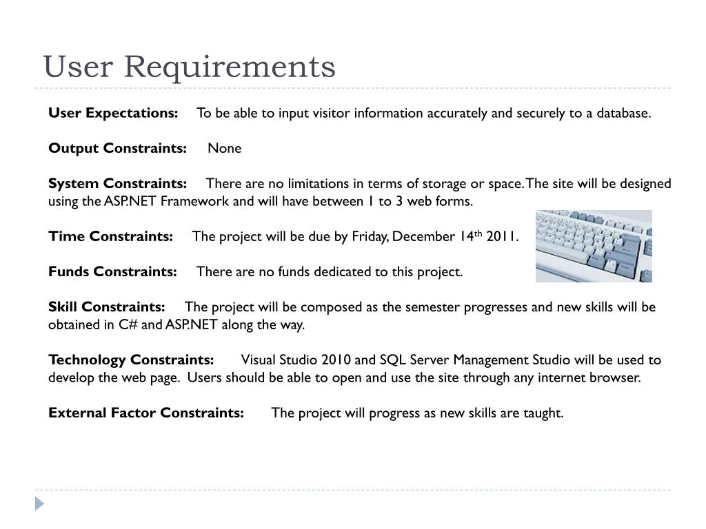 User Requirements User Expectations: To be able to input visitor information accurately and securely to a database. Output Constraints: None System Constraints: There are no limitations in terms of storage or space. The site will be designed using the ASP.NET Framework and will have between 1 to 3 web forms. Time Constraints: The project will be due by Friday, December 14th 2011. Funds Constraints: There are no funds dedicated to this project. Skill Constraints: The project will be composed as the semester progresses and new skills will be obtained in C# and ASP.NET along the way. Technology Constraints:Visual Studio 2010 and SQL Server Management Studio will be used to develop the web page. Users should be able to open and use the site through any internet browser. External Factor Constraints: The project will progress as new skills are taught.