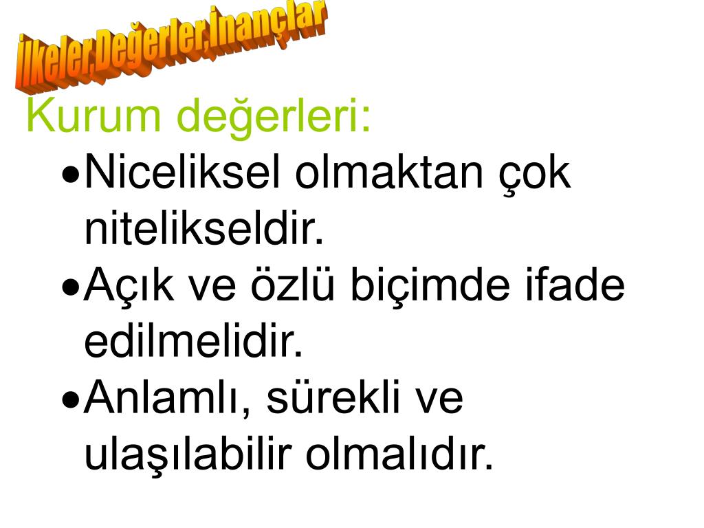 İlkeler,Değerler,İnançlar • Kurum değerleri: • Niceliksel olmaktan çok nitelikseldir. • Açık ve özlü biçimde ifade edilmelidir. • Anlamlı, sürekli ve ulaşılabilir olmalıdır.