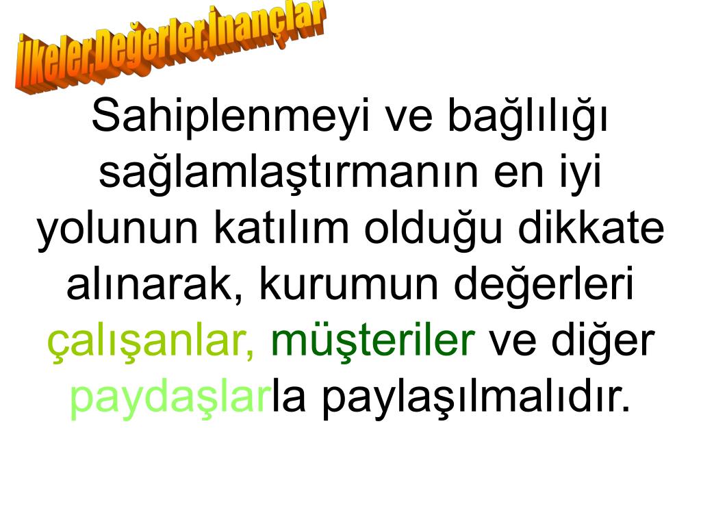 İlkeler,Değerler,İnançlar Sahiplenmeyi ve bağlılığı sağlamlaştırmanın en iyi yolunun katılım olduğu dikkate alınarak, kurumun değerleri çalışanlar,müşteriler ve diğer paydaşlarla paylaşılmalıdır.