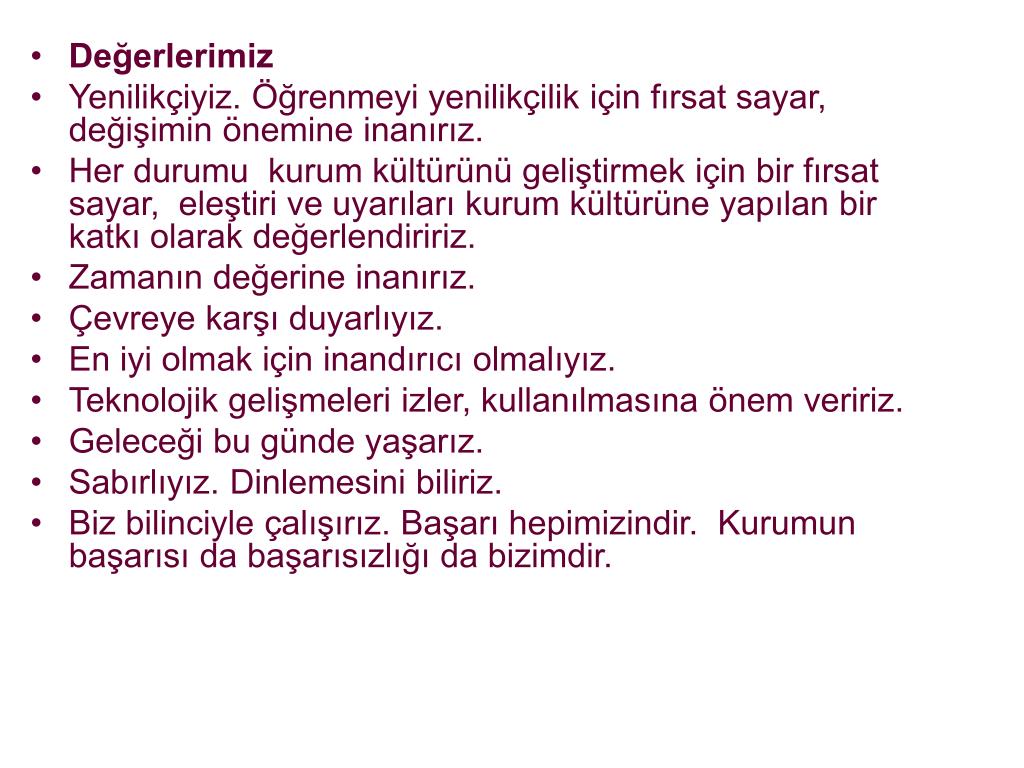 Değerlerimiz • Yenilikçiyiz. Öğrenmeyi yenilikçilik için fırsat sayar, değişimin önemine inanırız. • Her durumu kurum kültürünü geliştirmek için bir fırsat sayar, eleştiri ve uyarıları kurum kültürüne yapılan bir katkı olarak değerlendiririz. • Zamanın değerine inanırız. • Çevreye karşı duyarlıyız. • En iyi olmak için inandırıcı olmalıyız. • Teknolojik gelişmeleri izler, kullanılmasına önem veririz. • Geleceği bu günde yaşarız. • Sabırlıyız. Dinlemesini biliriz. • Biz bilinciyle çalışırız. Başarı hepimizindir. Kurumun başarısı da başarısızlığı da bizimdir.