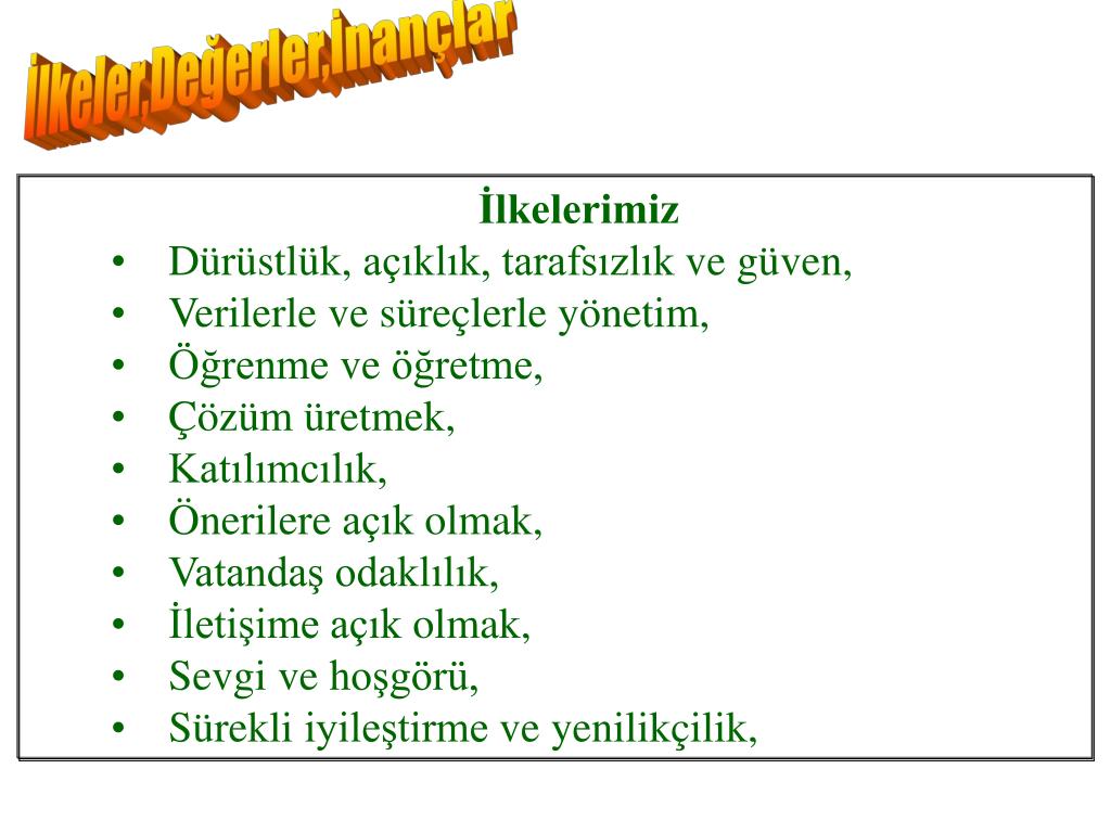 İlkeler,Değerler,İnançlar • İlkelerimiz • Dürüstlük, açıklık, tarafsızlık ve güven, • Verilerle ve süreçlerle yönetim, • Öğrenme ve öğretme, • Çözüm üretmek, • Katılımcılık, • Önerilere açık olmak, • Vatandaş odaklılık, • İletişime açık olmak, • Sevgi ve hoşgörü, • Sürekli iyileştirme ve yenilikçilik,