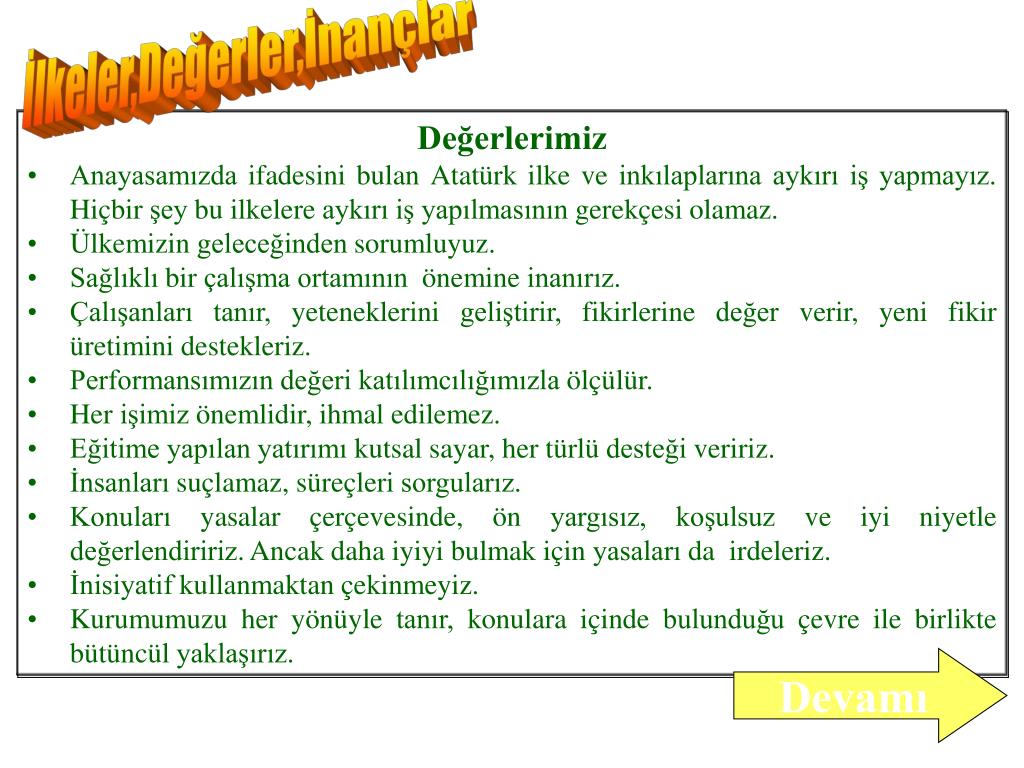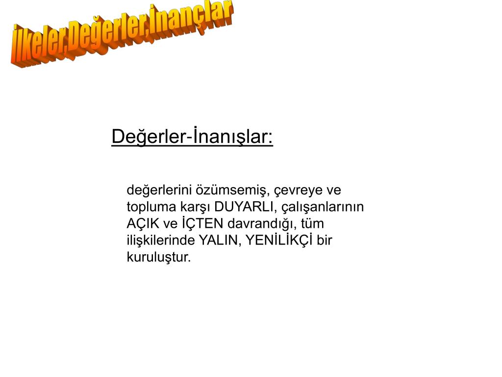 İlkeler,Değerler,İnançlar • Değerlerimiz • Anayasamızda ifadesini bulan Atatürk ilke ve inkılaplarına aykırı iş yapmayız. Hiçbir şey bu ilkelere aykırı iş yapılmasının gerekçesi olamaz. • Ülkemizin geleceğinden sorumluyuz. • Sağlıklı bir çalışma ortamının önemine inanırız. • Çalışanları tanır, yeteneklerini geliştirir, fikirlerine değer verir, yeni fikir üretimini destekleriz. • Performansımızın değeri katılımcılığımızla ölçülür. • Her işimiz önemlidir, ihmal edilemez. • Eğitime yapılan yatırımı kutsal sayar, her türlü desteği veririz. • İnsanları suçlamaz, süreçleri sorgularız. • Konuları yasalar çerçevesinde, ön yargısız, koşulsuz ve iyi niyetle değerlendiririz. Ancak daha iyiyi bulmak için yasaları da irdeleriz. • İnisiyatif kullanmaktan çekinmeyiz. • Kurumumuzu her yönüyle tanır, konulara içinde bulunduğu çevre ile birlikte bütüncül yaklaşırız. Devamı