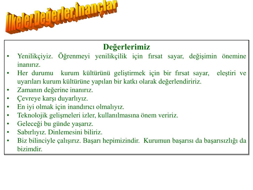 İlkeler,Değerler,İnançlar • Değerlerimiz • Yenilikçiyiz. Öğrenmeyi yenilikçilik için fırsat sayar, değişimin önemine inanırız. • Her durumu kurum kültürünü geliştirmek için bir fırsat sayar, eleştiri ve uyarıları kurum kültürüne yapılan bir katkı olarak değerlendiririz. • Zamanın değerine inanırız. • Çevreye karşı duyarlıyız. • En iyi olmak için inandırıcı olmalıyız. • Teknolojik gelişmeleri izler, kullanılmasına önem veririz. • Geleceği bu günde yaşarız. • Sabırlıyız. Dinlemesini biliriz. • Biz bilinciyle çalışırız. Başarı hepimizindir. Kurumun başarısı da başarısızlığı da bizimdir.