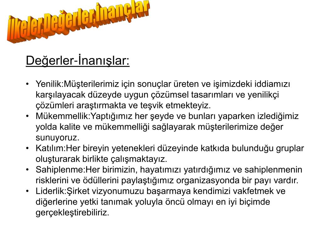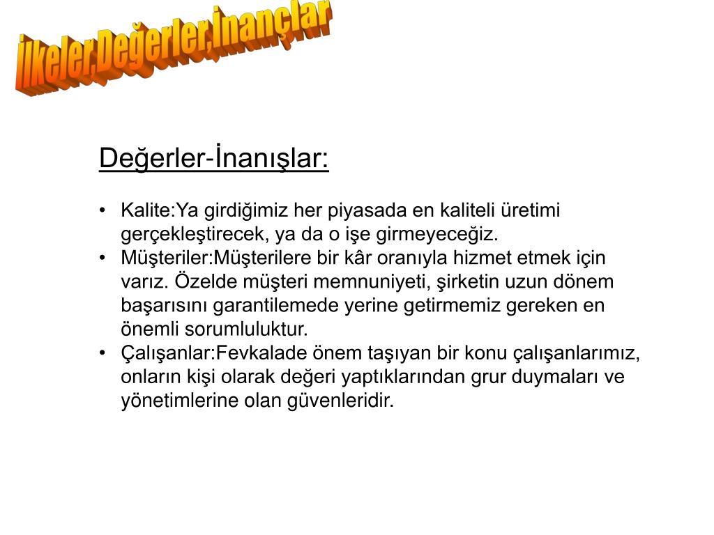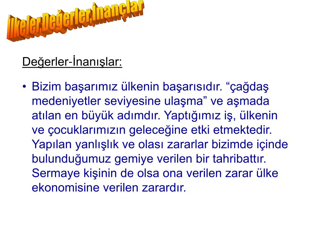 İlkeler,Değerler,İnançlar • Değerler-İnanışlar: • Bizim başarımız ülkenin başarısıdır. “çağdaş medeniyetler seviyesine ulaşma” ve aşmada atılan en büyük adımdır. Yaptığımız iş, ülkenin ve çocuklarımızın geleceğine etki etmektedir. Yapılan yanlışlık ve olası zararlar bizimde içinde bulunduğumuz gemiye verilen bir tahribattır. Sermaye kişinin de olsa ona verilen zarar ülke ekonomisine verilen zarardır.