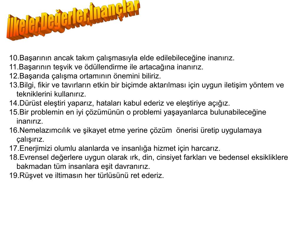 İlkeler,Değerler,İnançlar • 10.Başarının ancak takım çalışmasıyla elde edilebileceğine inanırız. • 11.Başarının teşvik ve ödüllendirme ile artacağına inanırız. • 12.Başarıda çalışma ortamının önemini biliriz. • 13.Bilgi, fikir ve tavırların etkin bir biçimde aktarılması için uygun iletişim yöntem ve tekniklerini kullanırız. • 14.Dürüst eleştiri yaparız, hataları kabul ederiz ve eleştiriye açığız. • 15.Bir problemin en iyi çözümünün o problemi yaşayanlarca bulunabileceğine inanırız. • 16.Nemelazımcılık ve şikayet etme yerine çözüm önerisi üretip uygulamaya çalışırız. • 17.Enerjimizi olumlu alanlarda ve insanlığa hizmet için harcarız. • 18.Evrensel değerlere uygun olarak ırk, din, cinsiyet farkları ve bedensel eksikliklere bakmadan tüm insanlara eşit davranırız. • 19.Rüşvet ve iltimasın her türlüsünü ret ederiz. • (Marmara Üniversitesi Mühendislik Fakültesi)