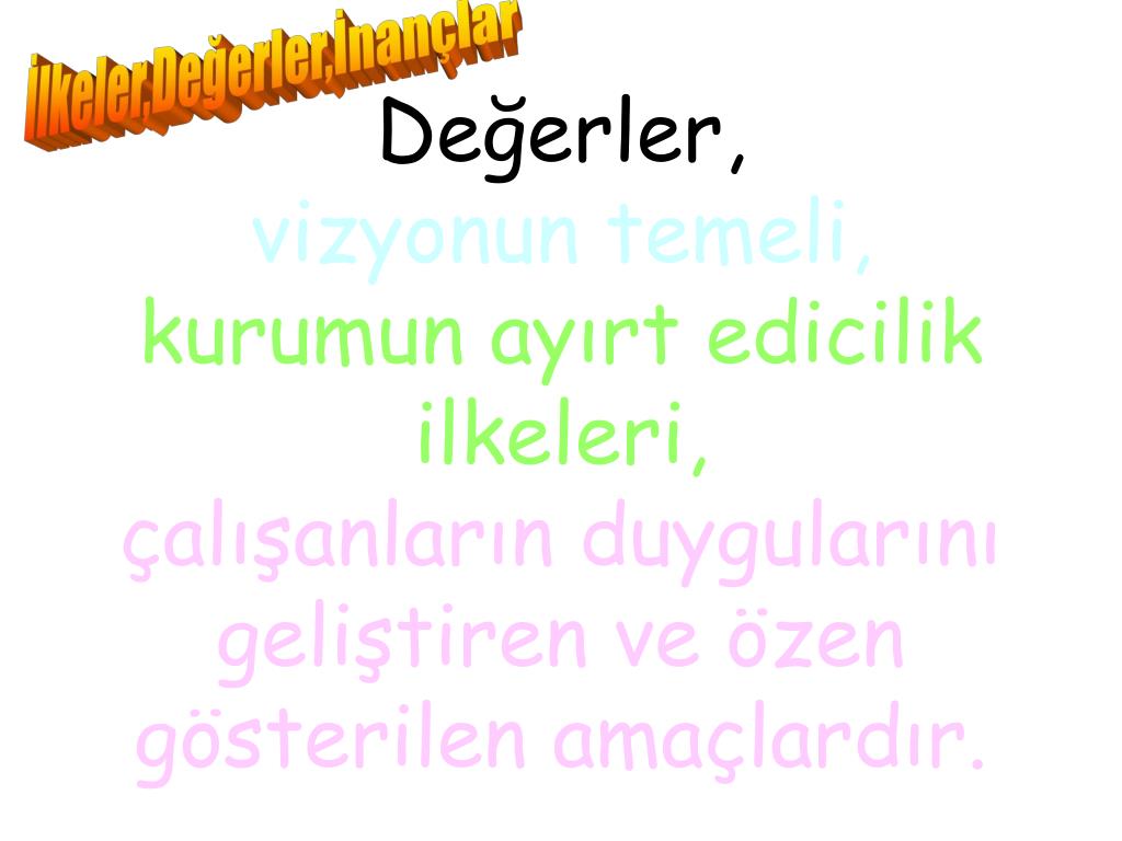 İlkeler,Değerler,İnançlar Değerler, vizyonun temeli, kurumun ayırt edicilik ilkeleri, çalışanların duygularını geliştiren ve özen gösterilen amaçlardır.