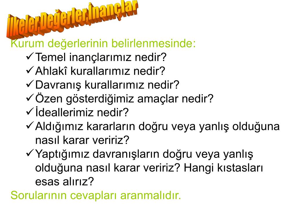İlkeler,Değerler,İnançlar • Kurum değerlerinin belirlenmesinde: • Temel inançlarımız nedir? • Ahlakî kurallarımız nedir? • Davranış kurallarımız nedir? • Özen gösterdiğimiz amaçlar nedir? • İdeallerimiz nedir? • Aldığımız kararların doğru veya yanlış olduğuna nasıl karar veririz? • Yaptığımız davranışların doğru veya yanlış olduğuna nasıl karar veririz? Hangi kıstasları esas alırız? Sorularının cevapları aranmalıdır.