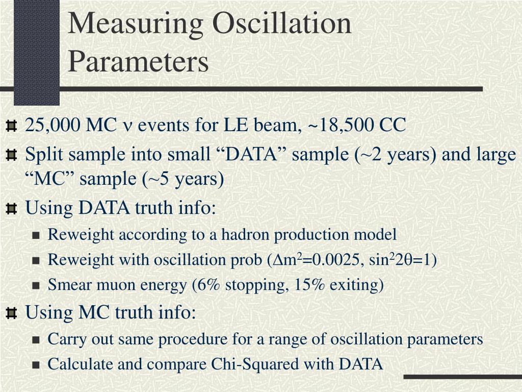 Measuring Oscillation Parameters • 25,000 MC n events for LE beam, ~18,500 CC • Split sample into small “DATA” sample (~2 years) and large “MC” sample (~5 years) • Using DATA truth info: • Reweight according to a hadron production model • Reweight with oscillation prob (Dm2=0.0025, sin22q=1) • Smear muon energy (6% stopping, 15% exiting) • Using MC truth info: • Carry out same procedure for a range of oscillation parameters • Calculate and compare Chi-Squared with DATA