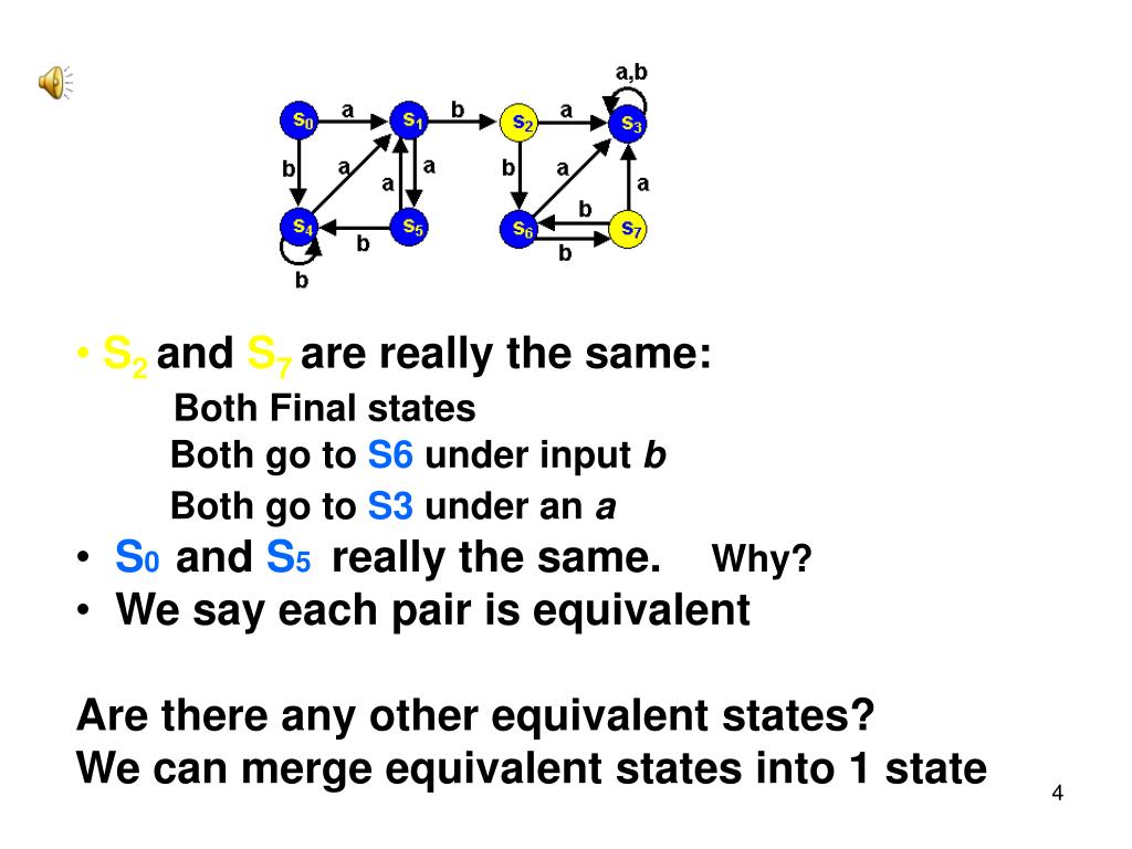 S2and S7are really the same: • Both Final states • Both go to S6 under input b • Both go to S3 under an a • S0and S5 really the same. Why? • We say each pair is equivalent • Are there any other equivalent states? • We can merge equivalent states into 1 state