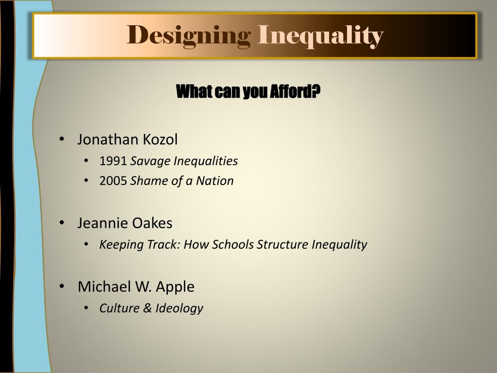 DesigningInequality What can you Afford? • Jonathan Kozol • 1991 Savage Inequalities • 2005 Shame of a Nation • Jeannie Oakes • Keeping Track: How Schools Structure Inequality • Michael W. Apple • Culture & Ideology