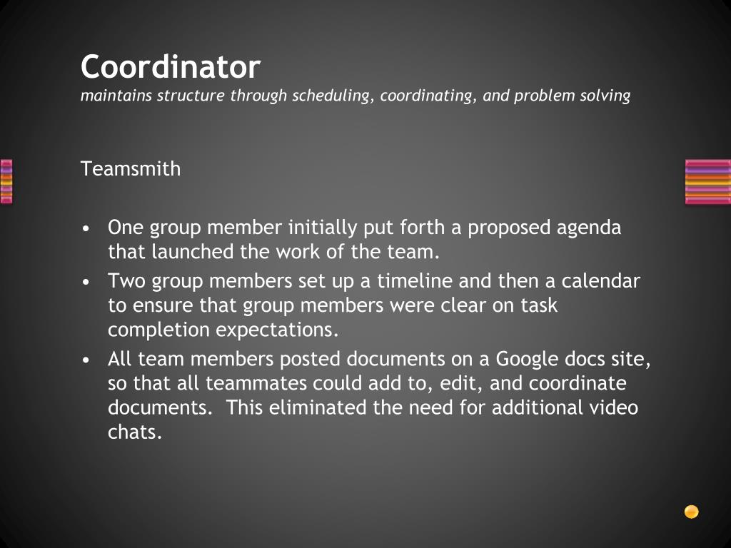 Coordinator maintains structure through scheduling, coordinating, and problem solving Teamsmith • One group member initially put forth a proposed agenda that launched the work of the team. • Two group members set up a timeline and then a calendar to ensure that group members were clear on task completion expectations. • All team members posted documents on a Google docs site, so that all teammates could add to, edit, and coordinate documents. This eliminated the need for additional video chats.