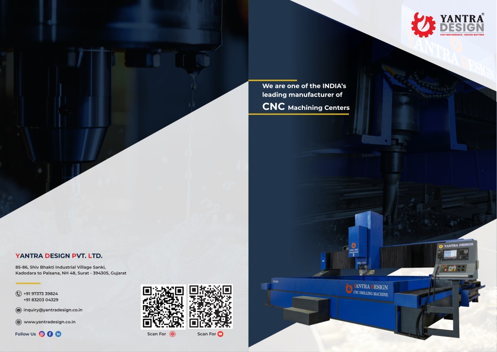 R FOR PERFORMANCE - DESIGN MATTERS We are one of the INDIA’s leading manufacturer of CNC Machining Centers Y ANTRA ESIGN VT. TD. D P L 85-86, Shiv Bhakti Industrial Village Sanki, Kadodara to Palsana, NH 48, Surat - 394305, Gujarat +91 97373 39824 +91 83203 04329 inquiry@yantradesign.co.in www.yantradesign.co.in Scan For Scan For Follow Us