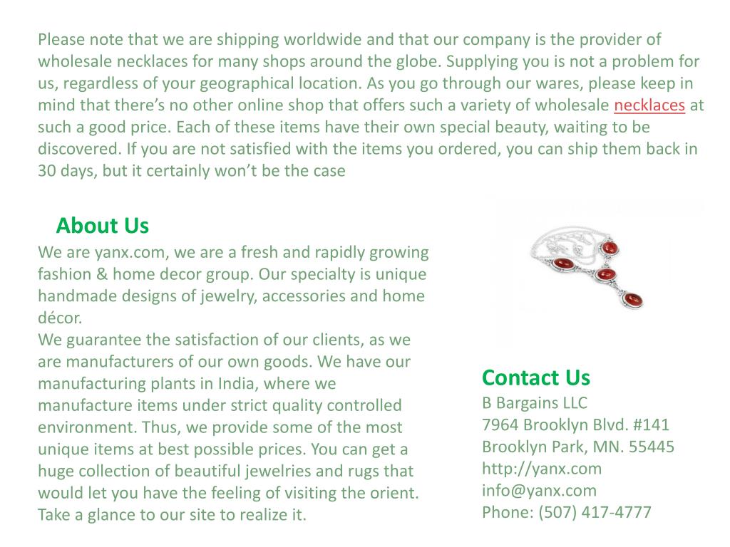 Please note that we are shipping worldwide and that our company is the provider of wholesale necklaces for many shops around the globe. Supplying you is not a problem for us, regardless of your geographical location. As you go through our wares, please keep in mind that there’s no other online shop that offers such a variety of wholesale necklaces at such a good price. Each of these items have their own special beauty, waiting to be discovered. If you are not satisfied with the items you ordered, you can ship them back in 30 days, but it certainly won’t be the case About Us We are yanx.com, we are a fresh and rapidly growing fashion & home decor group. Our specialty is unique handmade designs of jewelry, accessories and home décor. We guarantee the satisfaction of our clients, as we are manufacturers of our own goods. We have our manufacturing plants in India, where we manufacture items under strict quality controlled environment. Thus, we provide some of the most unique items at best possible prices. You can get a huge collection of beautiful jewelries and rugs that would let you have the feeling of visiting the orient. Take a glance to our site to realize it. Contact Us B Bargains LLC7964 Brooklyn Blvd. #141Brooklyn Park, MN. 55445http://yanx.com info@yanx.com Phone: (507) 417-4777