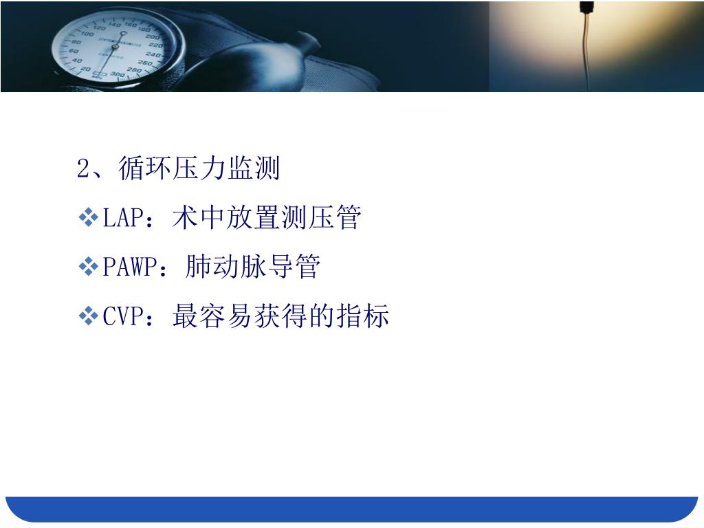 2、循环压力监测 • LAP:术中放置测压管 • PAWP:肺动脉导管 • CVP:最容易获得的指标