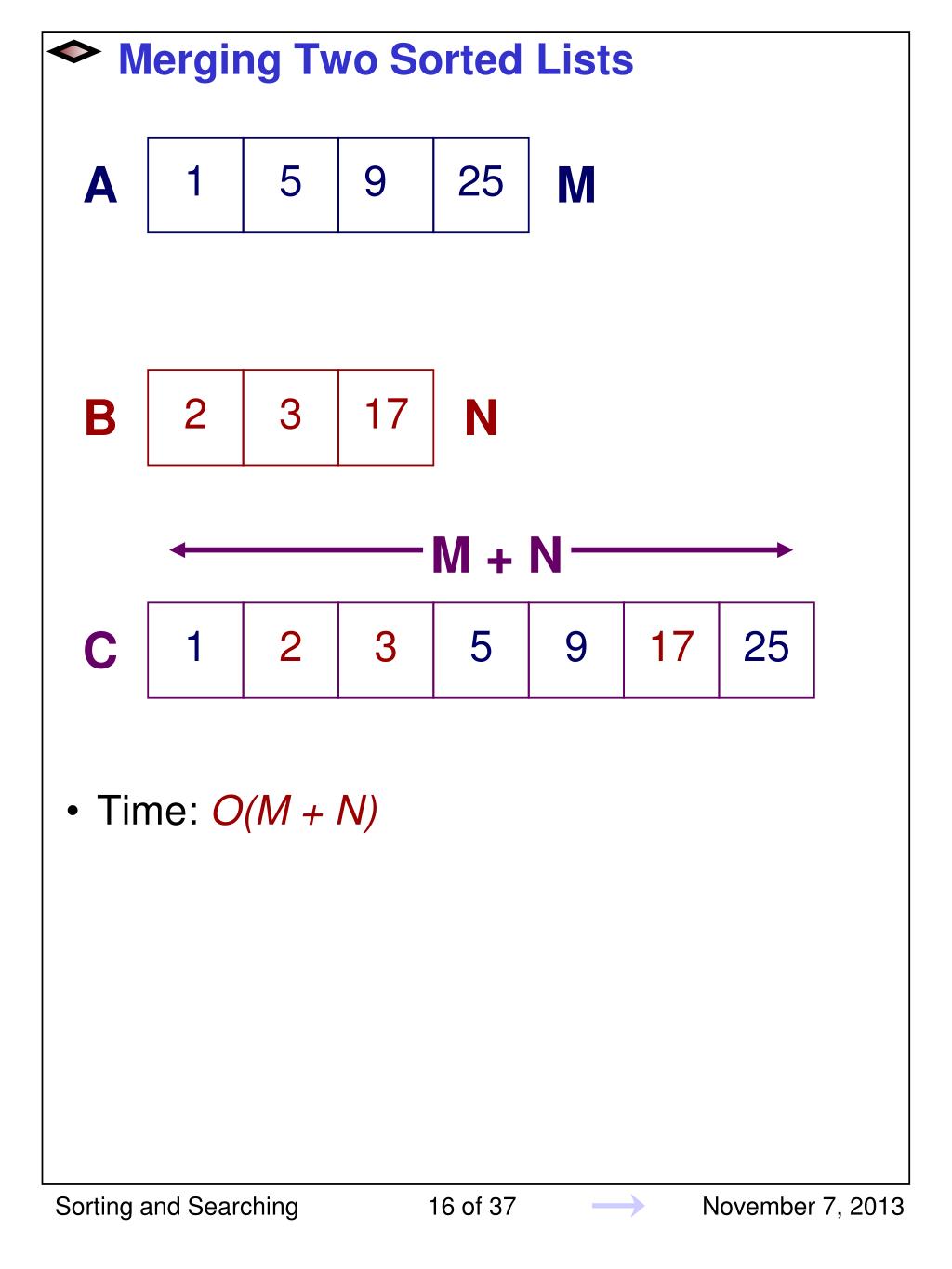 Merging Two Sorted Lists • Time: O(M + N) A 1 5 9 25 M B 2 3 17 N M + N C 1 2 3 5 9 17 25 Sorting and Searching
