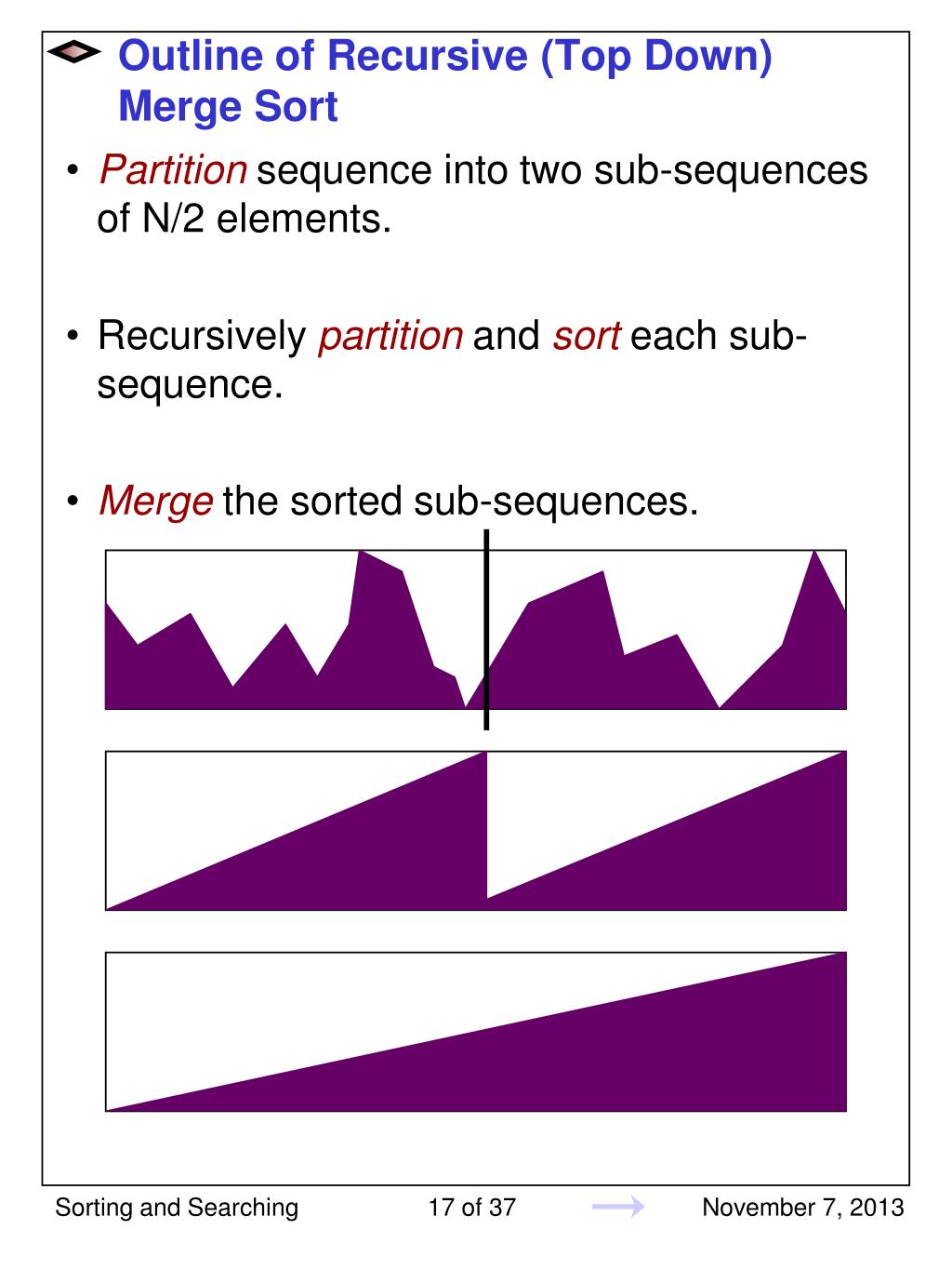 Outline of Recursive (Top Down) Merge Sort • Partition sequence into two sub-sequences of N/2 elements. • Recursively partition and sort each sub-sequence. • Merge the sorted sub-sequences. Sorting and Searching