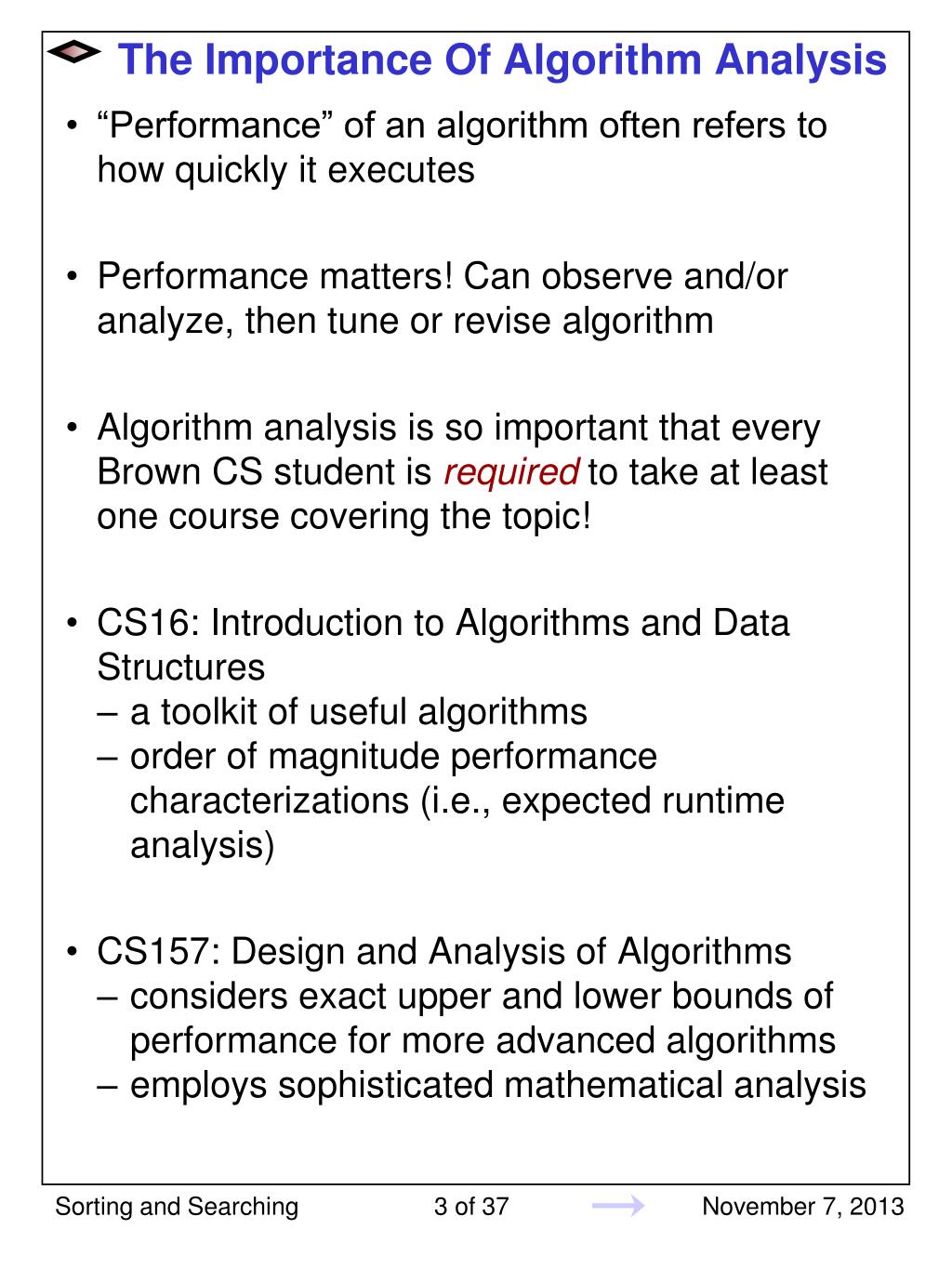 The Importance Of Algorithm Analysis • “Performance” of an algorithm often refers to how quickly it executes • Performance matters! Can observe and/or analyze, then tune or revise algorithm • Algorithm analysis is so important that every Brown CS student is required to take at least one course covering the topic! • CS16: Introduction to Algorithms and Data Structures • a toolkit of useful algorithms • order of magnitude performance characterizations (i.e., expected runtime analysis) • CS157: Design and Analysis of Algorithms • considers exact upper and lower bounds of performance for more advanced algorithms • employs sophisticated mathematical analysis Sorting and Searching
