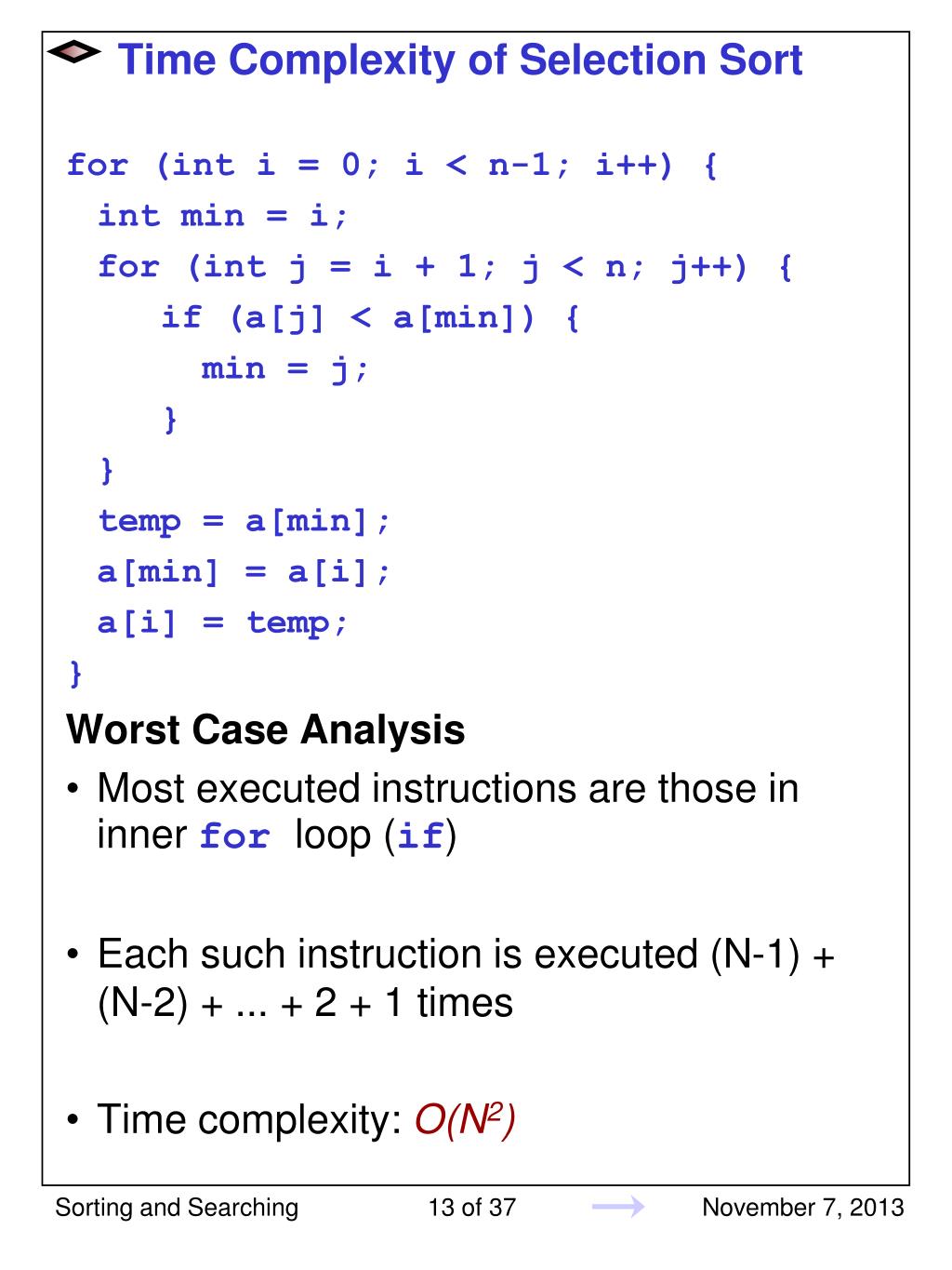Time Complexity of Selection Sort for (int i = 0; i < n-1; i++) { int min = i; for (int j = i + 1; j < n; j++) { if (a[j] < a[min]) { min = j; } } temp = a[min]; a[min] = a[i]; a[i] = temp; } Worst Case Analysis • Most executed instructions are those in innerforloop (if) • Each such instruction is executed (N-1) + (N-2) + ... + 2 + 1 times • Time complexity: O(N2) Sorting and Searching