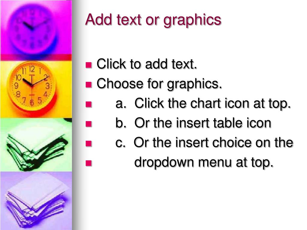 Add text or graphics • Click to add text. • Choose for graphics. • a. Click the chart icon at top. • b. Or the insert table icon • c. Or the insert choice on the • dropdown menu at top.