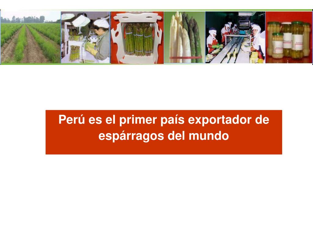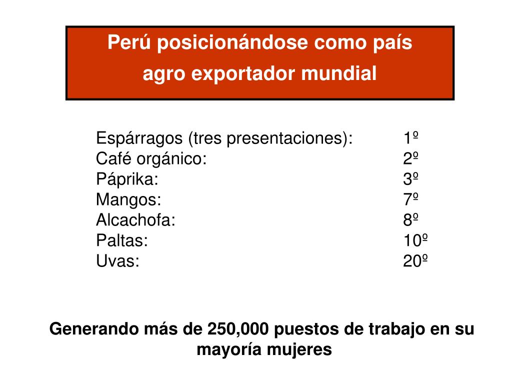 Perú posicionándose como país agro exportador mundial Espárragos (tres presentaciones): 1º Café orgánico: 2º Páprika: 3º Mangos: 7º Alcachofa: 8º Paltas: 10º Uvas: 20º Generando más de 250,000 puestos de trabajo en su mayoría mujeres