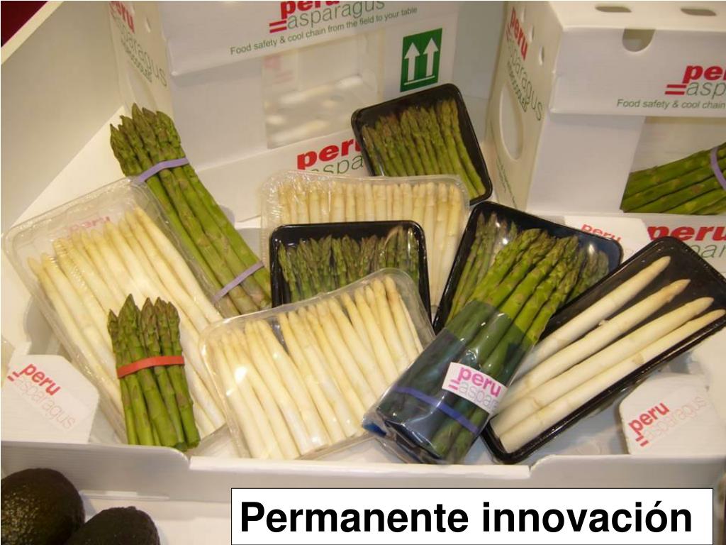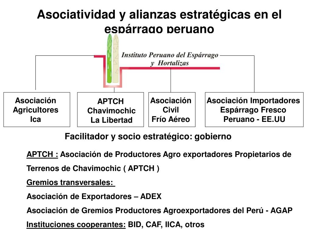 Asociatividad y alianzas estratégicas en el espárrago peruano Asociación Agricultores Ica Asociación Civil Frío Aéreo Asociación Importadores Espárrago Fresco Peruano - EE.UU APTCH Chavimochic La Libertad Facilitador y socio estratégico: gobierno APTCH : Asociación de Productores Agro exportadores Propietarios de Terrenos de Chavimochic ( APTCH ) Gremios transversales: Asociación de Exportadores – ADEX Asociación de Gremios Productores Agroexportadores del Perú - AGAP Instituciones cooperantes: BID, CAF, IICA, otros