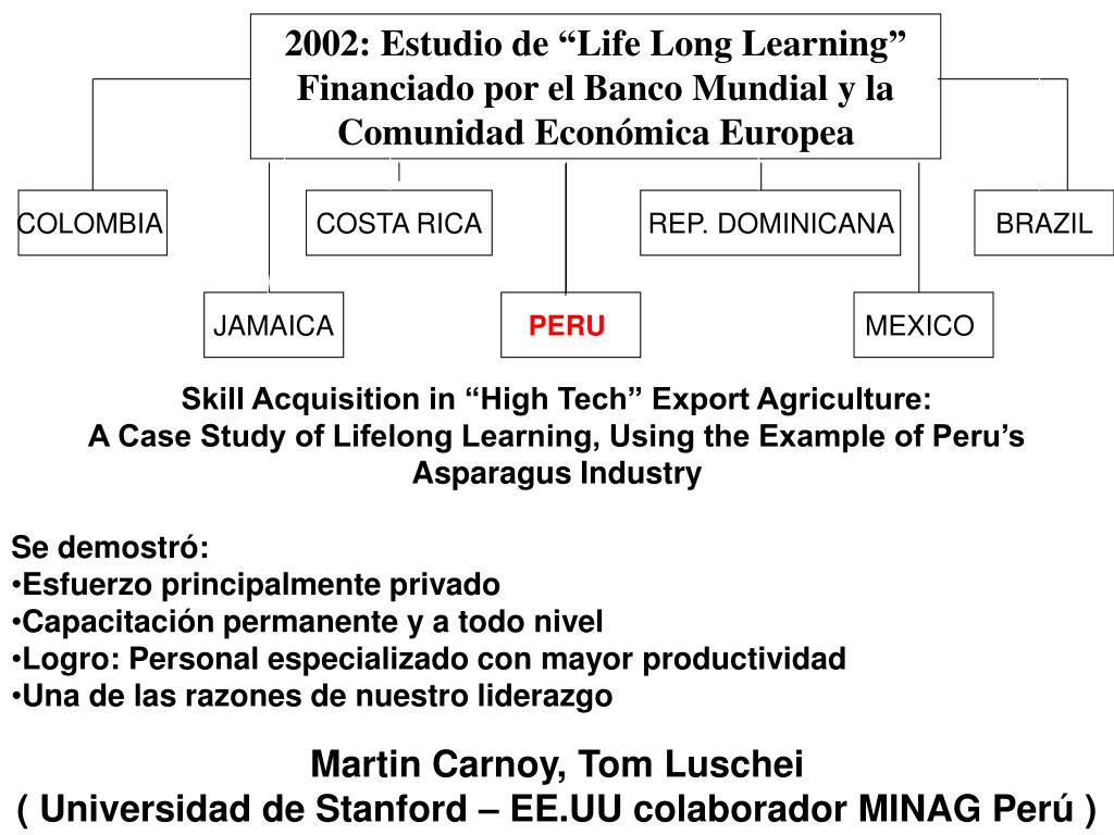 2002: Estudio de “Life Long Learning” Financiado por el Banco Mundial y la Comunidad Económica Europea COLOMBIA COSTA RICA REP. DOMINICANA BRAZIL JAMAICA PERU MEXICO • Skill Acquisition in “High Tech” Export Agriculture: • A Case Study of Lifelong Learning, Using the Example of Peru’s Asparagus Industry • Se demostró: • Esfuerzo principalmente privado • Capacitación permanente y a todo nivel • Logro: Personal especializado con mayor productividad • Una de las razones de nuestro liderazgo Martin Carnoy, Tom Luschei ( Universidad de Stanford – EE.UU colaborador MINAG Perú )