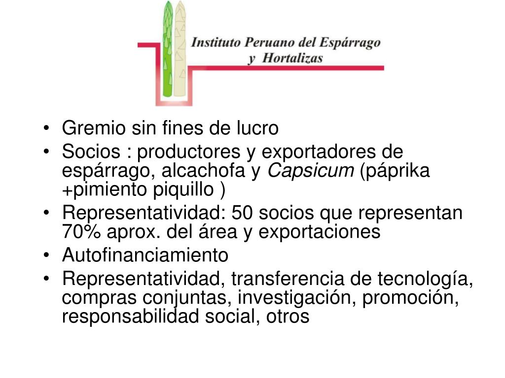 Gremio sin fines de lucro Socios : productores y exportadores de espárrago, alcachofa y Capsicum (páprika +pimiento piquillo ) Representatividad: 50 socios que representan 70% aprox. del área y exportaciones Autofinanciamiento Representatividad, transferencia de tecnología, compras conjuntas, investigación, promoción, responsabilidad social, otros