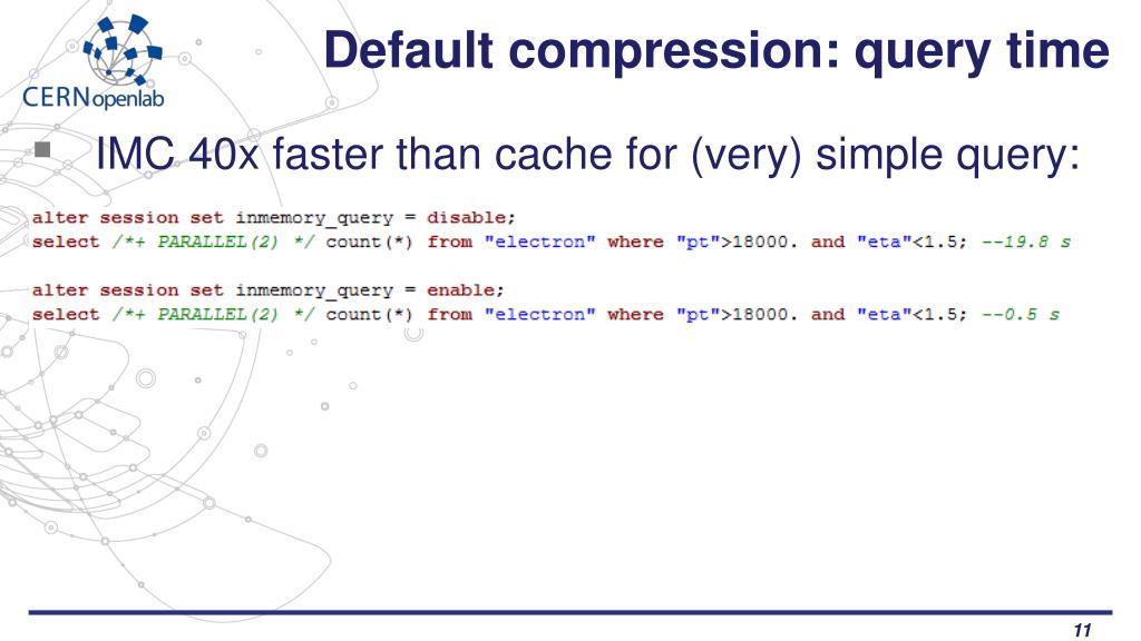 In-Memory Columnar table sizes • Test COMPRESS FOR QUERY vs CAPACITY HIGH • “EF”-> trigger-data, only booleans, best compression • “MET”-> table with floats & double, worst compression