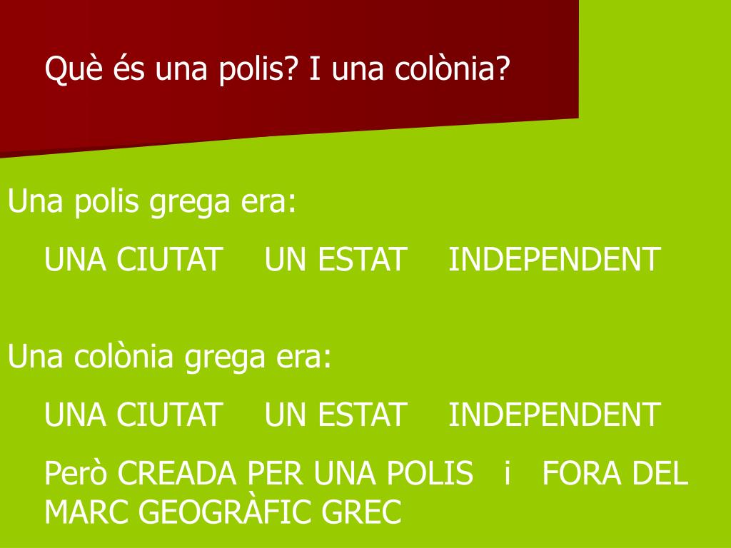 Què és una polis? I una colònia? • Una polis grega era: • UNA CIUTAT UN ESTAT INDEPENDENT • Una colònia grega era: • UNA CIUTAT UN ESTAT INDEPENDENT • Però CREADA PER UNA POLIS i FORA DEL MARC GEOGRÀFIC GREC
