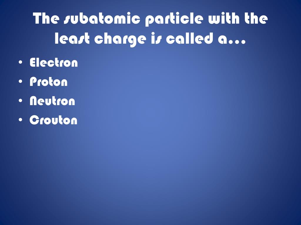 The subatomic particle with the least charge is called a… • Electron • Proton • Neutron • Crouton