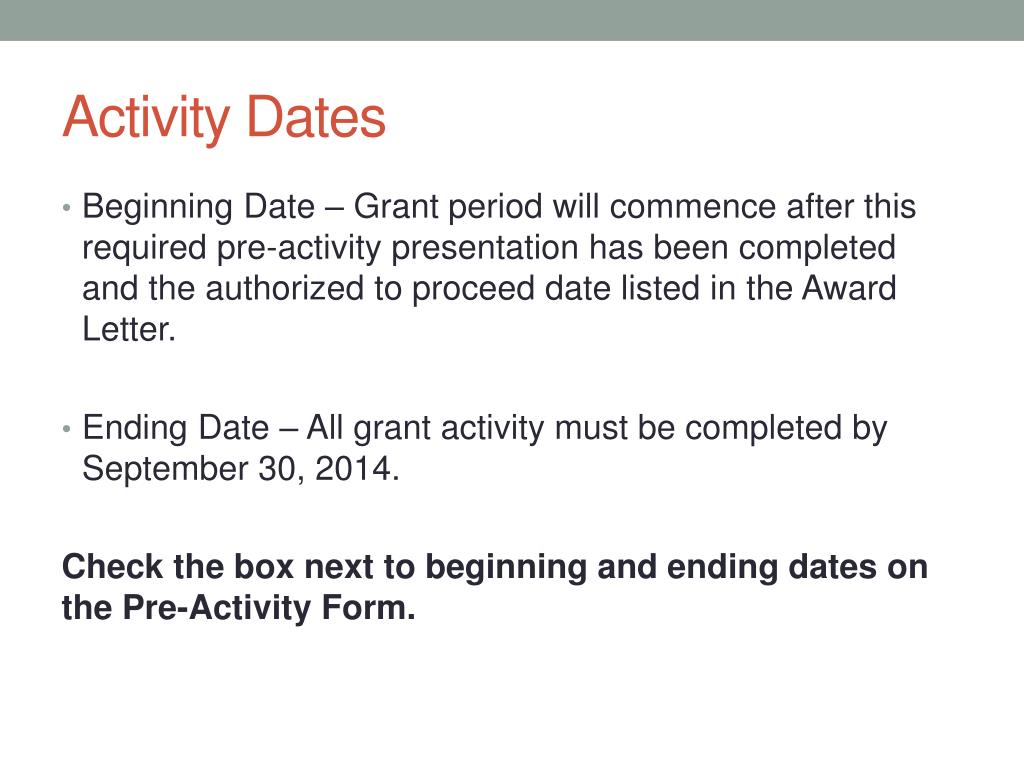 Activity Dates • Beginning Date – Grant period will commence after this required pre-activity presentation has been completed and the authorized to proceed date listed in the Award Letter. • Ending Date – All grant activity must be completed by September 30, 2014. Check the box next to beginning and ending dates on the Pre-Activity Form.