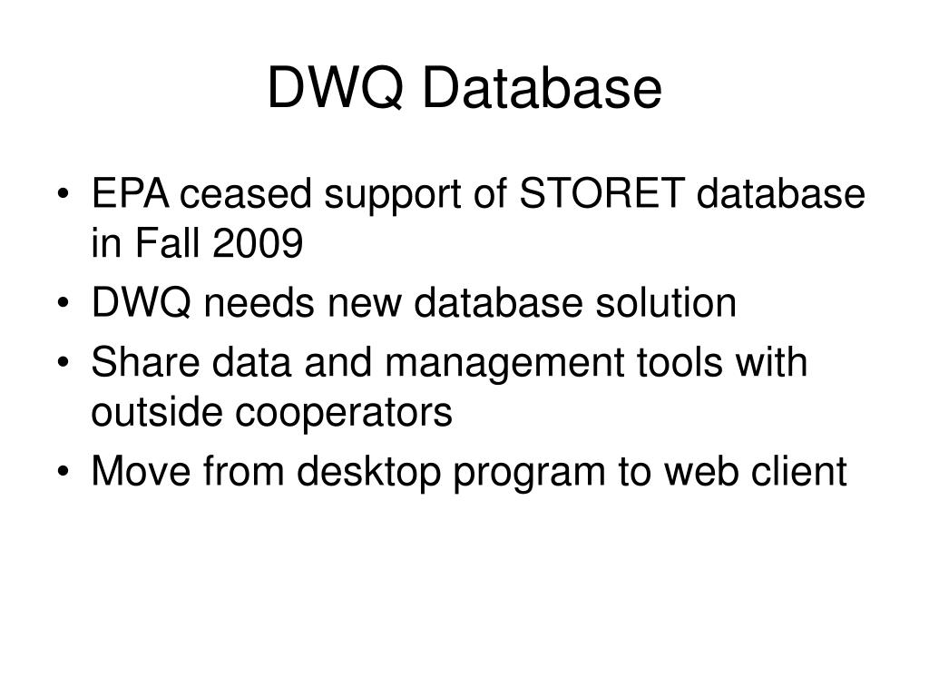 DWQ Database • EPA ceased support of STORET database in Fall 2009 • DWQ needs new database solution • Share data and management tools with outside cooperators • Move from desktop program to web client