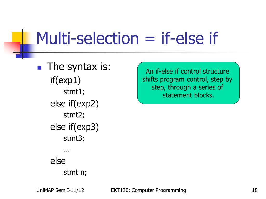 Multi-selection = if-else if • The syntax is: if(exp1) stmt1; else if(exp2) stmt2; else if(exp3) stmt3; … else stmt n; An if-else if control structure shifts program control, step by step, through a series of statement blocks. EKT120: Computer Programming