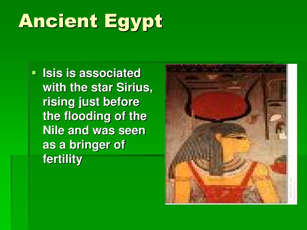 Isis is associated with the star Sirius, rising just before the flooding of the Nile and was seen as a bringer of fertility Ancient Egypt