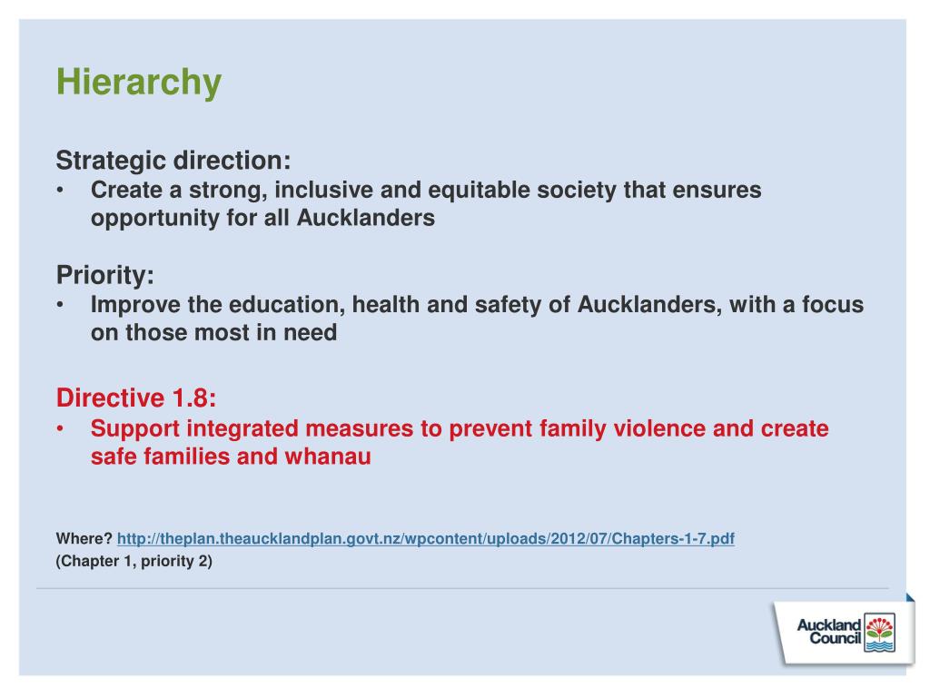 Hierarchy Strategic direction: Create a strong, inclusive and equitable society that ensures opportunity for all Aucklanders Priority: Improve the education, health and safety of Aucklanders, with a focus on those most in need Directive 1.8: Support integrated measures to prevent family violence and create safe families and whanau Where? http://theplan.theaucklandplan.govt.nz/wpcontent/uploads/2012/07/Chapters-1-7.pdf (Chapter 1, priority 2)