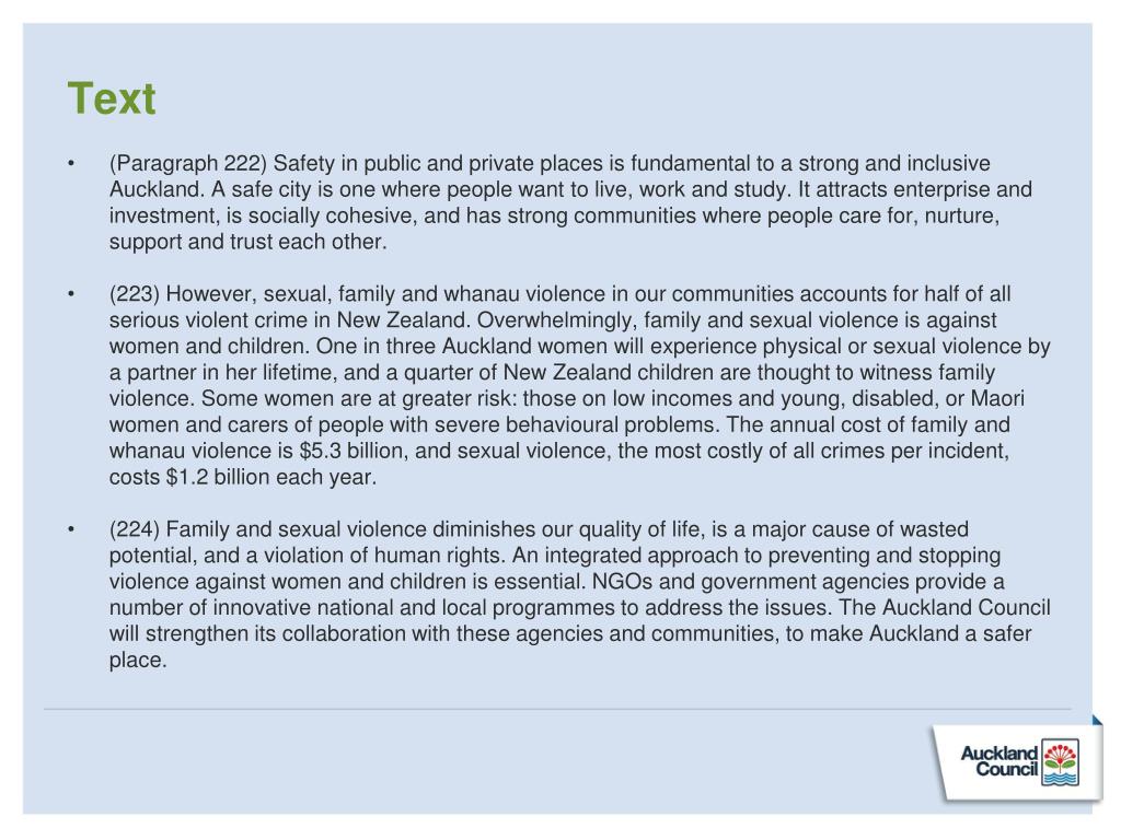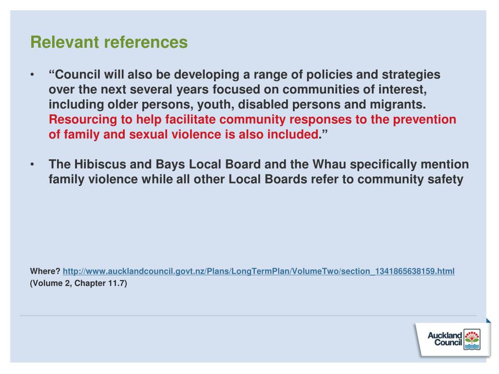 Relevant references “Council will also be developing a range of policies and strategies over the next several years focused on communities of interest, including older persons, youth, disabled persons and migrants. Resourcing to help facilitate community responses to the prevention of family and sexual violence is also included.” The Hibiscus and Bays Local Board and the Whau specifically mention family violence while all other Local Boards refer to community safety Where? http://www.aucklandcouncil.govt.nz/Plans/LongTermPlan/VolumeTwo/section_1341865638159.html (Volume 2, Chapter 11.7)