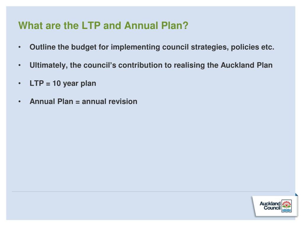 What are the LTP and Annual Plan? Outline the budget for implementing council strategies, policies etc. Ultimately, the council’s contribution to realising the Auckland Plan LTP = 10 year plan Annual Plan = annual revision