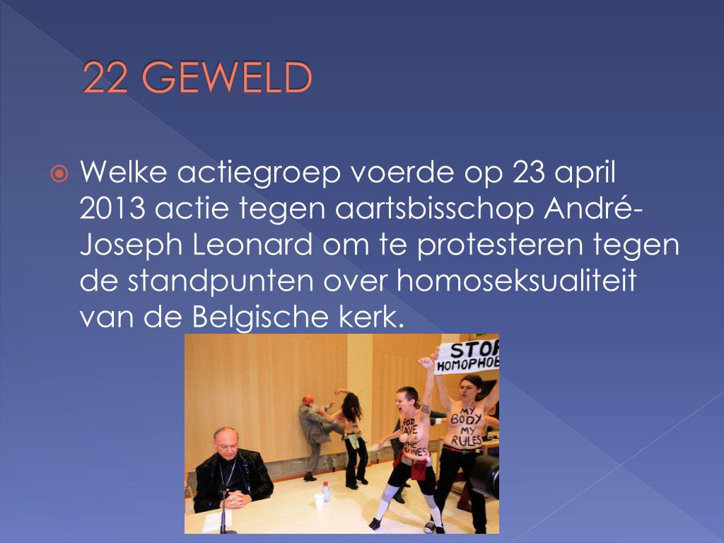 22 GEWELD • Welke actiegroep voerde op 23 april 2013 actie tegen aartsbisschop André-Joseph Leonard om te protesteren tegen de standpunten over homoseksualiteit van de Belgische kerk.