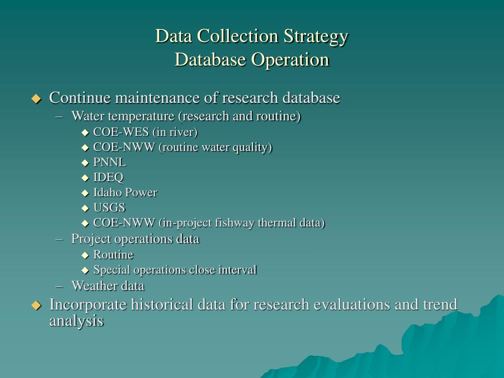 Data Collection StrategyDatabase Operation • Continue maintenance of research database • Water temperature (research and routine) • COE-WES (in river) • COE-NWW (routine water quality) • PNNL • IDEQ • Idaho Power • USGS • COE-NWW (in-project fishway thermal data) • Project operations data • Routine • Special operations close interval • Weather data • Incorporate historical data for research evaluations and trend analysis