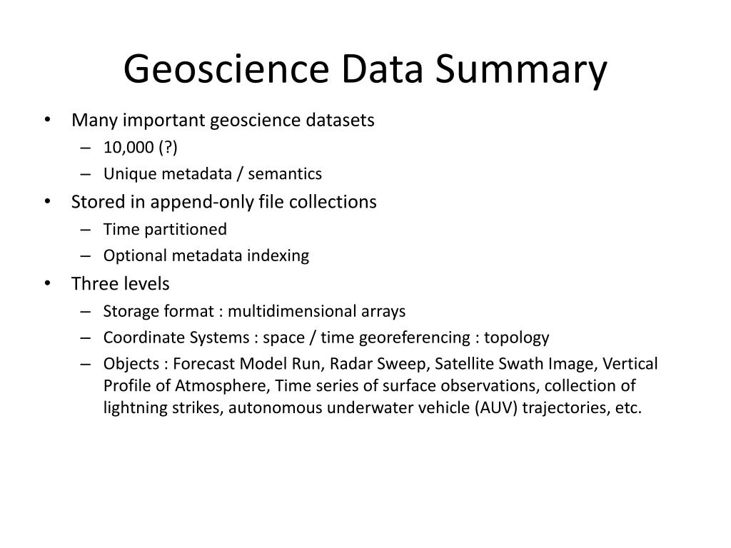 Geoscience Data Summary • Many important geoscience datasets • 10,000 (?) • Unique metadata / semantics • Stored in append-only file collections • Time partitioned • Optional metadata indexing • Three levels • Storage format : multidimensional arrays • Coordinate Systems : space / time georeferencing : topology • Objects : Forecast Model Run, Radar Sweep, Satellite Swath Image, Vertical Profile of Atmosphere, Time series of surface observations, collection of lightning strikes, autonomous underwater vehicle (AUV) trajectories, etc.